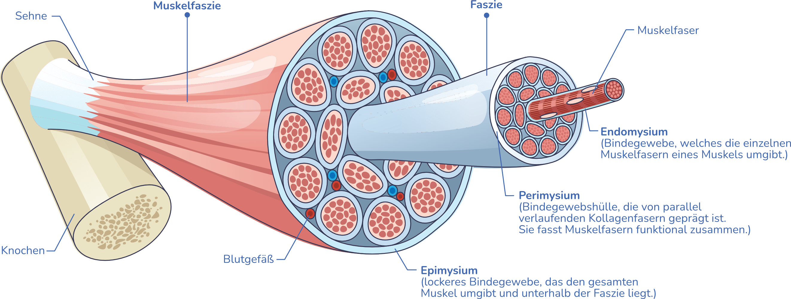 Faszien bilden ein feinmaschiges Geflecht, das alle Muskeln, Knochen, Organe usw. umhüllt und durchdringt. Das ist am Beispiel der Muskeln so zu verstehen, dass nicht nur der Muskel als Ganzes in ein fasziales Netz verpackt ist, sondern jeder einzelne Muskelstrang und jede einzelne Muskelzelle.